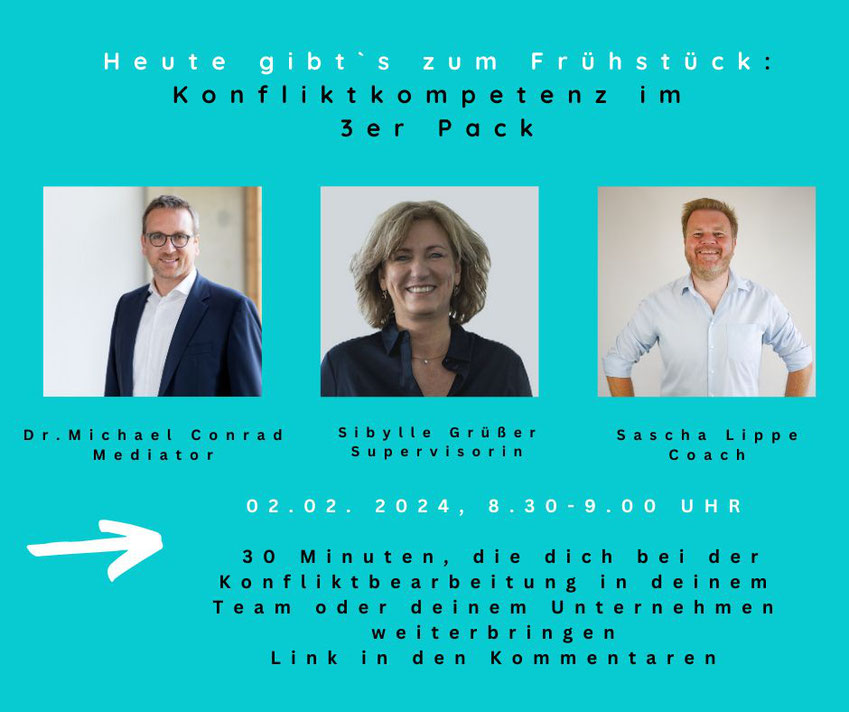 Wirtschaftsmediation · 24. Januar 2024 Online Break - Konflliktkompetenz im 3 er Pack 📌Konflikte blockieren, kosten Zeit, Geld und Nerven, verhindern Veränderung, machen krank… JA, aber nur wenn wir uns ihnen nicht stellen, sie nicht bearbeiten❗ 📢 Wir geben dir schnell umsetzbare Tipps, die dich in der Konfliktbearbeitung weiterbringen. So kannst die positive Schubkraft von Konflikten für dich nutzen. 💡 📌WIR, das sind Dr. Michael Conrad - Mathematiker, Mediator, Coach Sibylle Grüßer - Diplom-Kauffrau, Mediatorin, Supervisorin, Coach, Trainerin Sascha Lippe - Diplom-Kaufmann, Mediator, Coach, Change Begleiter Hier geht´s zur Konfliktbearbeitung aus gleich drei Perspektiven: https://lnkd.in/eZBvBiSX Hashtag#mediation Hashtag#supervision Hashtag#coaching Hashtag#konfliktlösung Hashtag#teamkonflikte Hashtag#konfliktmoderation Hier geht´s zur Konfilktbearbeitung aus gleich drei unterschiedlichen Perspektiven: https://us02web.zoom.us/j/81524458202?pwd=cFlDLzhGQThSRUxlT2 tagPlaceholderTags: Mediation, konfliktlösungen, Konflikt, Wirtschaftsmediation, Konfliktmanagement
